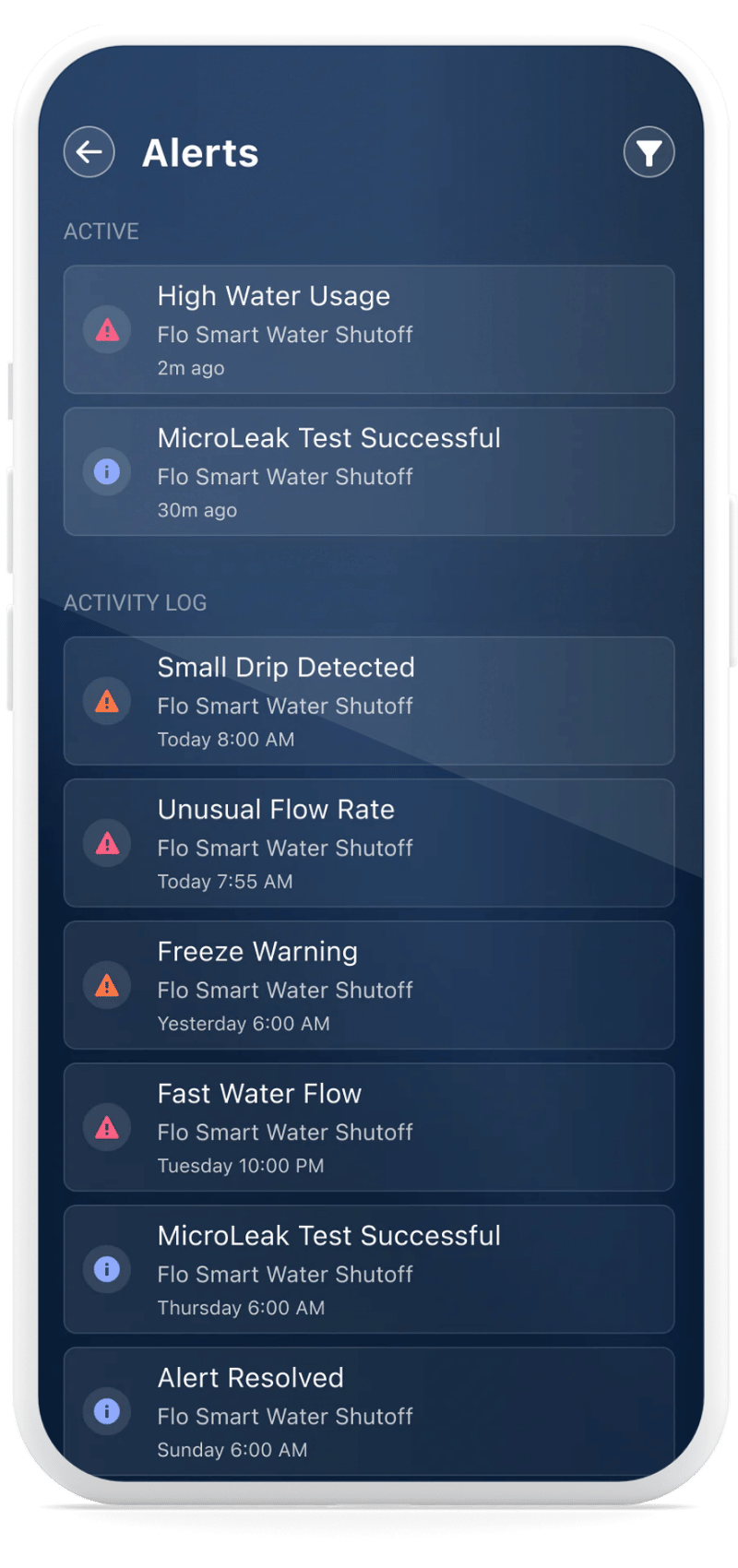 Receive detailed alerts about high water usage, unusual flow rates and freeze warnings, so you can quickly dismiss or address potential leaks.